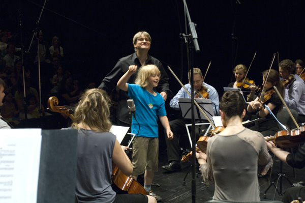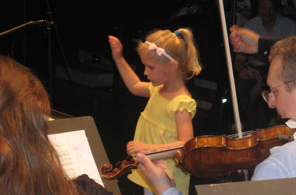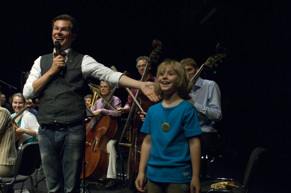 Das Publikum sang mit dem Orchester zusammen zwei Kanons, die die Kinder in ihren Einrichtungen vorher gelernt hatten, und als Überraschung durfte jeweils ein Kind zum Schluss das Orchester beim „Radetzky-Marsch“ dirigieren.